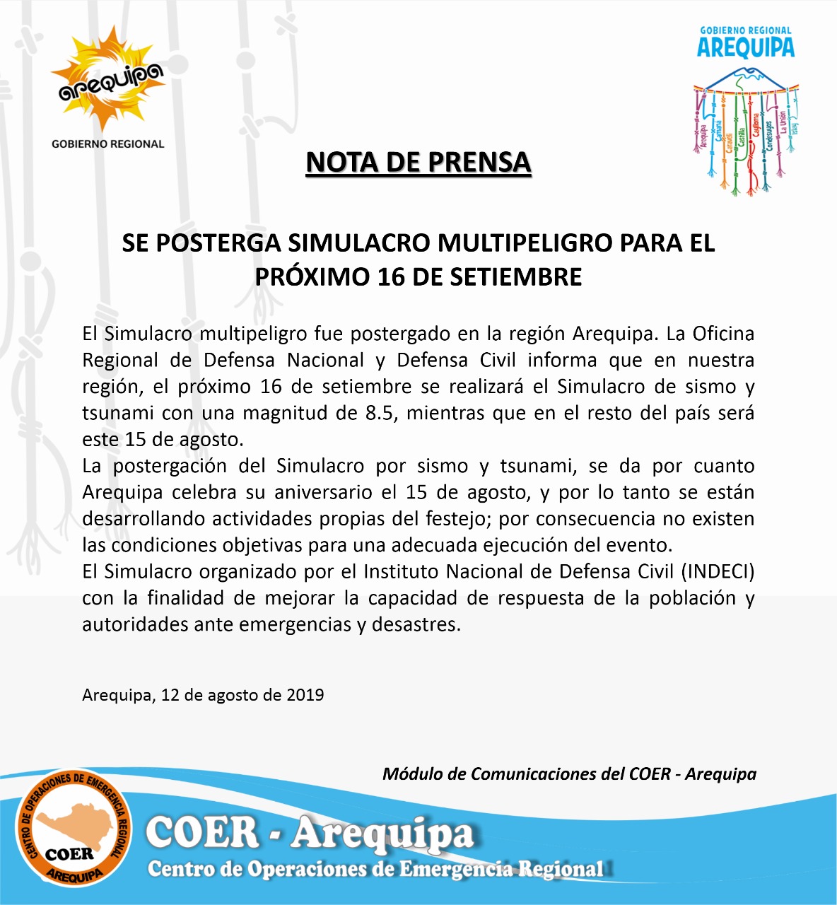 Nota de presa  016 se posterga Simulacro Multipeligro